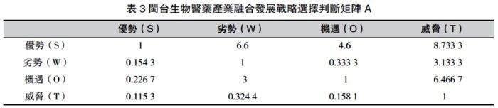 [表3:閩台生物醫藥產業融合發展戰略選擇判斷矩陣A]