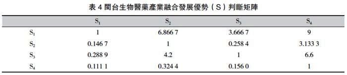 [表4:閩台生物醫藥產業融合發展優勢(S)判斷矩陣]
