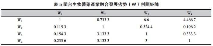 [表5:閩台生物醫藥產業融合發展劣勢(W)判斷矩陣]