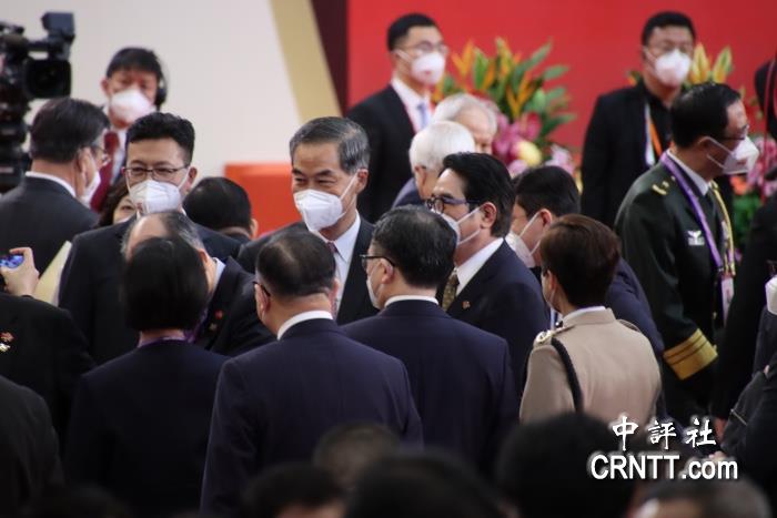 其中,最受關注的莫過於香港政府官員的互動。中評社記者注意到,全國政協副主席、前行政長官梁振英在入場後一直與現場嘉賓不停互動,他的身邊總是有一群人和其合影或是交談。剛剛卸任行政長官的林鄭月娥也不時與現場嘉賓交談。