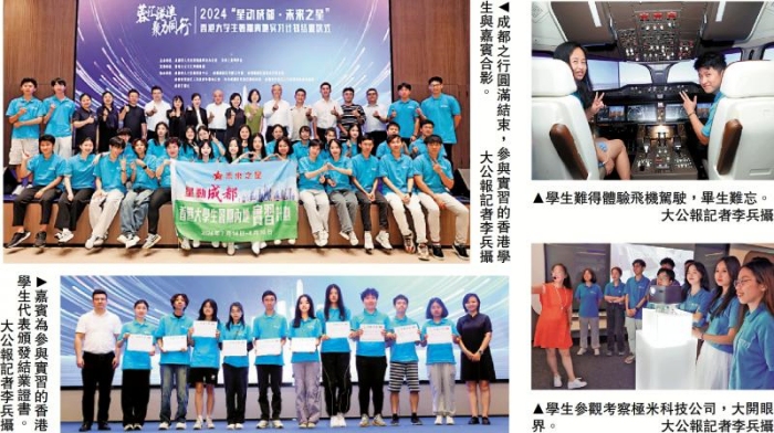 中評社北京8月10日電/據大公報報導,8月9日,“蓉匯港澳,聚力同行”——2024星動成都·未來之星香港大學生暑期內地實習計劃結業儀式在成都“大飛機示範產業園”隆重舉行,標誌著為期近一個月的實習計劃圓滿結束。自7月15日開始,來自香港大學、香港城市大學等高校的30名香港青年大學生走進成都,分成三個小組在成都高新區、雙流區以及成都日報社的10家企業或機構實習。