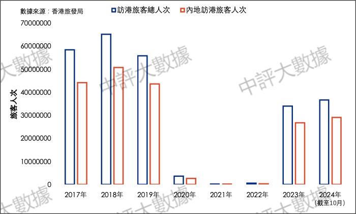 圖1 自2017年以來訪港旅客總人次與內地訪港旅客人次按年變化(中評智庫大數據中心製圖)