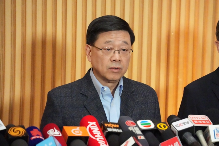 | 李家超就大埔宏福苑五級火警跟進工作見傳媒。(圖片來源:大公文匯) |