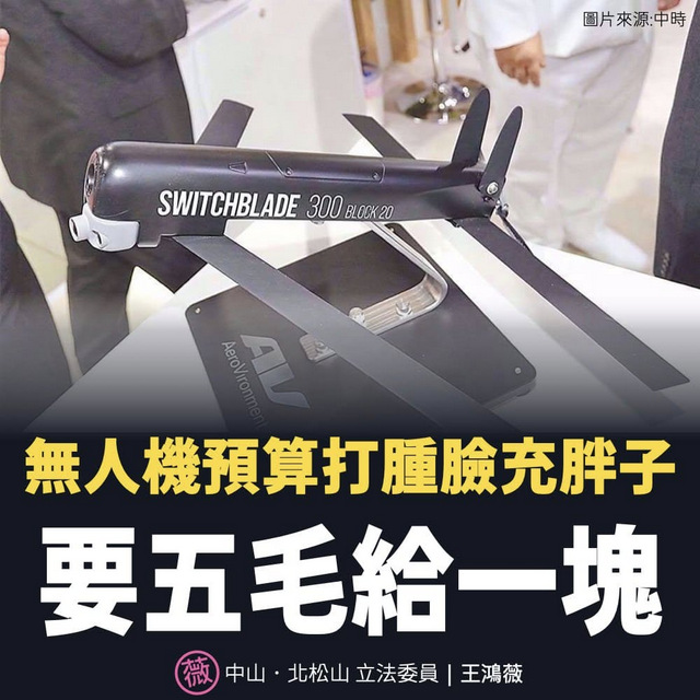 藍委王鴻薇批評,台軍方要五毛給一塊,無人機預算是打腫臉充胖子嗎?(王鴻薇臉書)