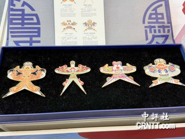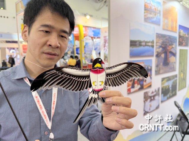 高雄市旅行公會冬季國際旅展有設攤介紹北京景點,國家級非遺“曹雪芹風箏”第四代傳承人繆伯剛介紹文創小物風箏造型冰箱貼。(中評社 蔣繼平攝)