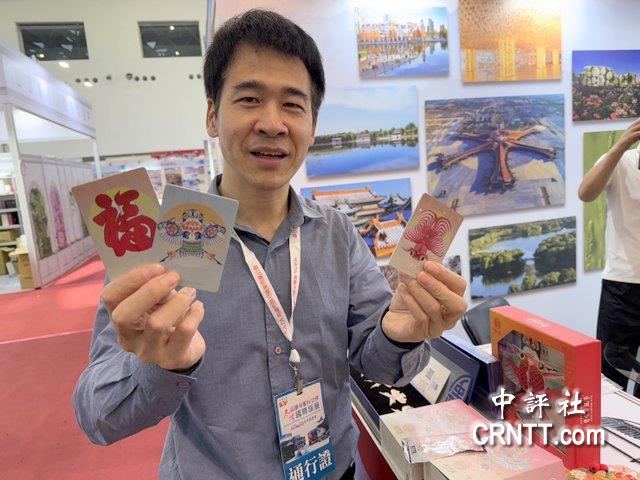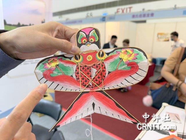 高雄市旅行公會冬季國際旅展有設攤介紹北京景點,國家級非遺“曹雪芹風箏”第四代傳承人繆伯剛介紹攤位準備的文創小物。(中評社 蔣繼平攝)