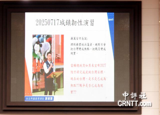 國民黨台北市議員游淑慧秀出台北市長蔣萬安曾在賴清德面前提醒戰爭危險的簡報。(中評社 張穎齊攝)