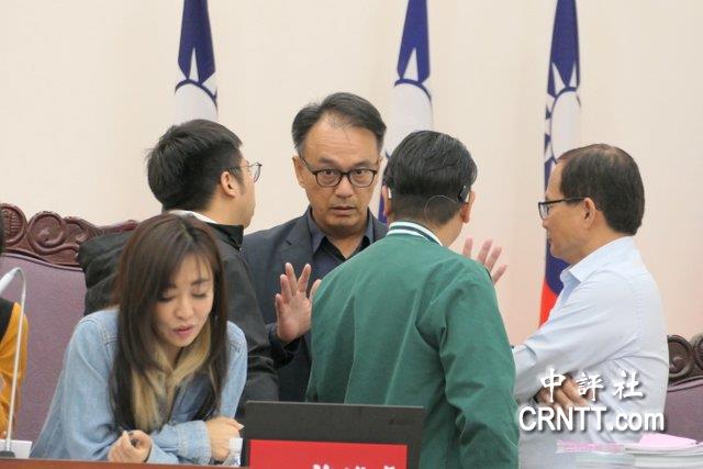 民眾黨籍新竹市議員李國璋和民進黨籍新竹市議員進行溝通。(中評社 盧誠輝攝)