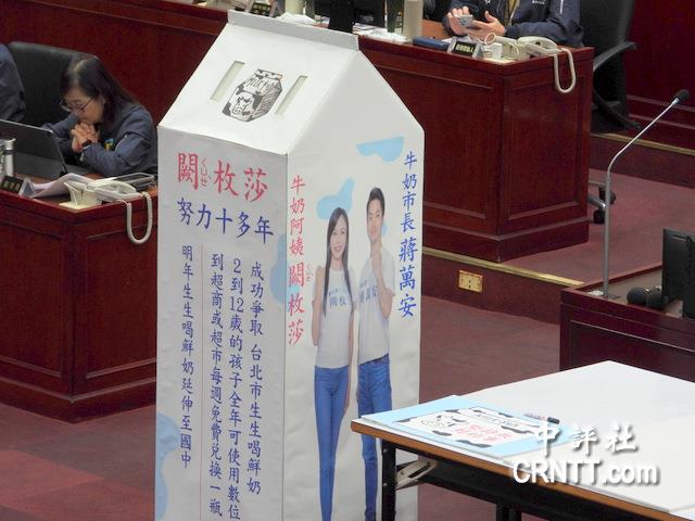 國民黨台北市議員闕枚莎將巨型大鮮奶盒放在議場。(中評社 張穎齊攝)