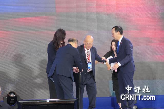 朱立倫與鄭麗文一同攙扶前主席吳伯雄走下舞台。(中評社 張嘉文攝)