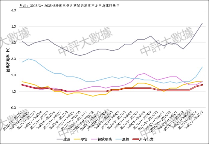 圖6 自2023年以來幾個主要受擴大輸入外勞計劃影響行業的移動三個月期間就業不足率變化及其與整體行業的對比(中評智庫大數據中心製圖)