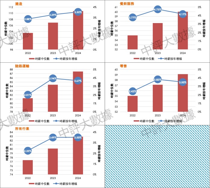 圖7 2022至2024年幾個主要受擴大輸入外勞計劃影響行業的時薪中位數及按年增幅變化與整體行業水平的對比(中評智庫大數據中心製圖)