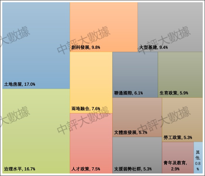 圖3 香港社交媒體對2025年度施政報告所提及的各主要政策範疇的關注度分布(中評智庫大數據中心製圖)
