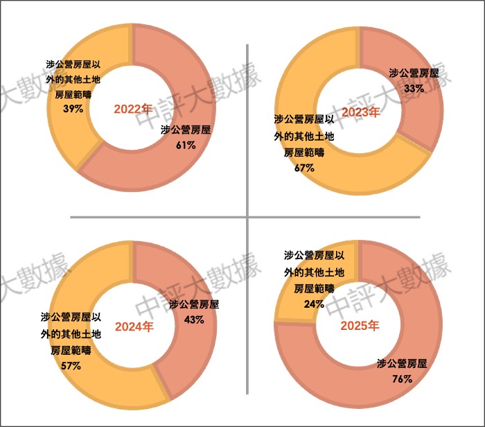 從圖4可見,今年施政報告與公營房屋板塊相關的舉措,在整體涉土地房屋政策中的能見度可謂相當高;其於香港社交媒體所引發的關注度,在整體涉土地房屋範疇討論中的佔比超過四分之三,所囊括的份額是本屆特區政府歷份施政報告中之最,甚至較2022年特區政府首次提出簡約公屋項目時還高。