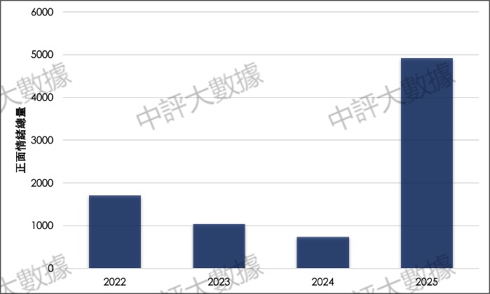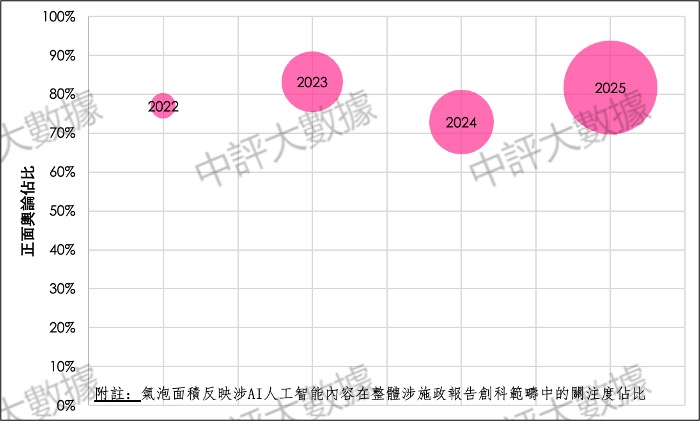 自2023年度的施政報告以來,特區政府在AI人工智能的舉措就愈趨引發香港市民關注。而今年施政報告中與AI人工智能相關的板塊,於社交媒體所引發的關注度在整體創科範疇中的佔比更是達至新高;而涉AI人工智能討論中的正面輿論佔比亦逼近八成的極高比例(見圖7)。