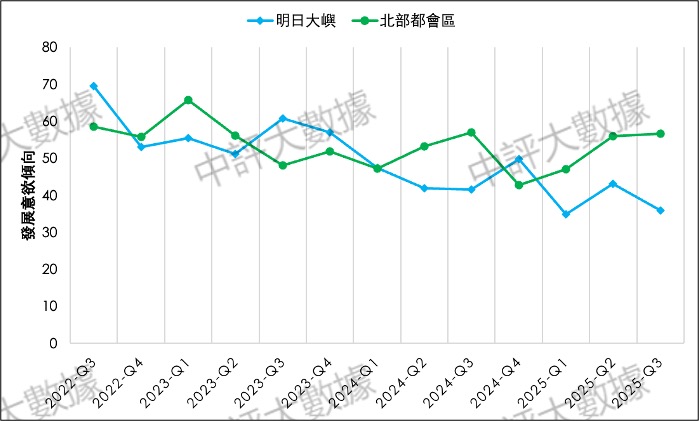 圖8 近3年來香港社交媒體對北部都會區及明日大嶼的發展意欲傾向變化對比(中評智庫大數據中心製圖)