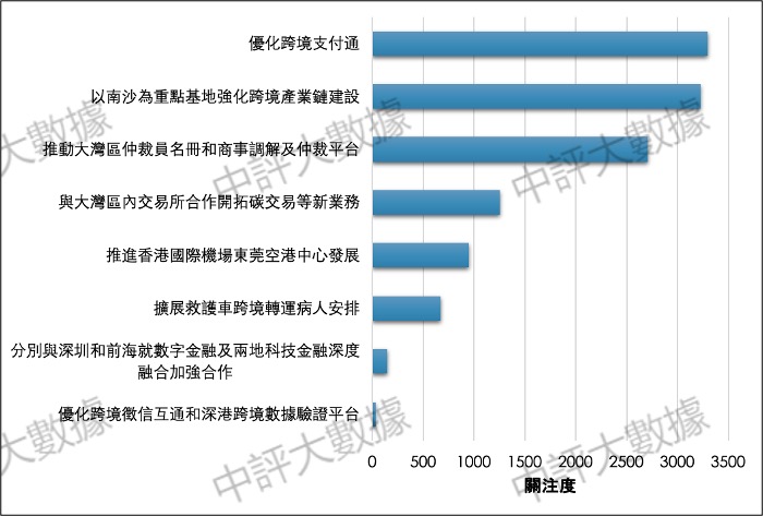 圖9 香港社交媒體對2025年度施政報告中與大灣區三地規則銜接與機制對接相關主要舉措的關注度對比(中評智庫大數據中心製圖)