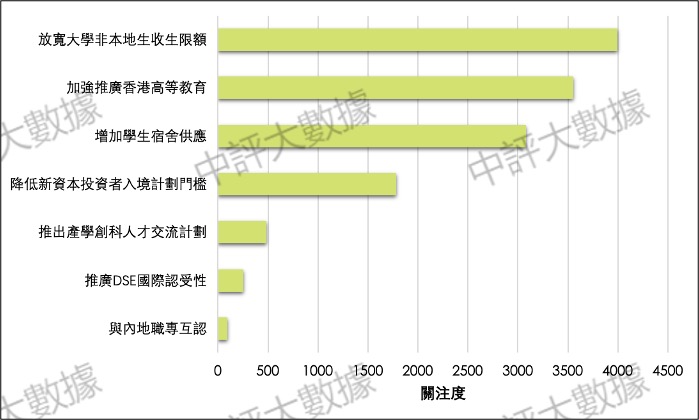 由圖10可知,今年施政報告涉人才政策的部分,與過去幾年相比有較為明顯的調整。此前幾份施政報告的人才政策重心,主要放在放寬並優化人才入境計劃之上。但今年卻更重視如何配合香港打造國際教育樞紐的戰略目標,從提升香港本地教育對海內外學子吸引力的層面人手,以此招徠更多更年輕且充滿活力的人才新血。有關措施包括放寬大學非本地生收生限額、加強推廣香港高等教育、增加學生宿舍供應等。另施政報告也有繼續著眼改善現行的人才簽證計劃,如放寬新資本投資者入境計劃的門檻,將購買非住宅物業的可算入額由1000萬提升至1500萬,並將可算入的住宅物業投資成交價從5000萬下調至3000萬。