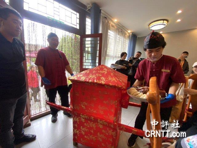 豬臉石烹宴上菜時會由轎子抬入,相當有創意。(中評社 盧誠輝攝)