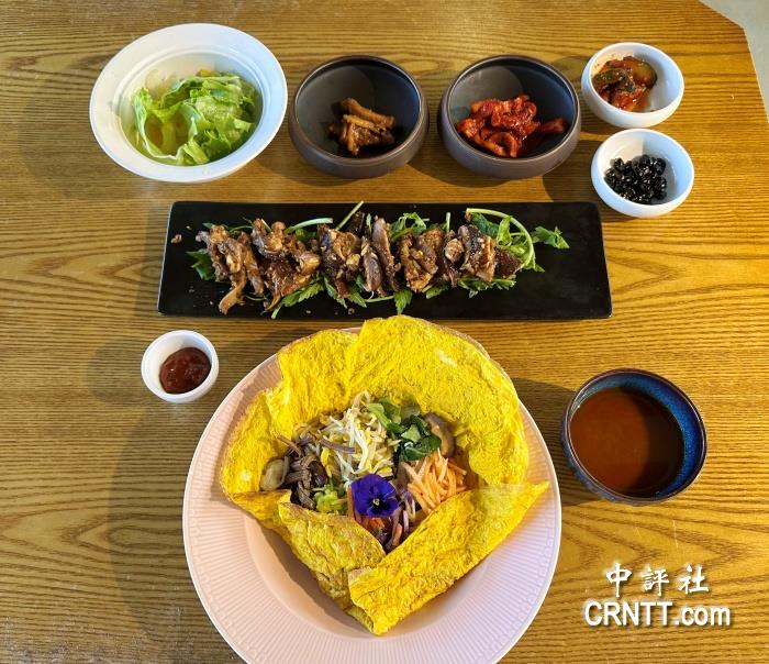 校村三百年家餐館——“金冠花拌飯與香菇水芹”。(中評社 崔銀珍攝)