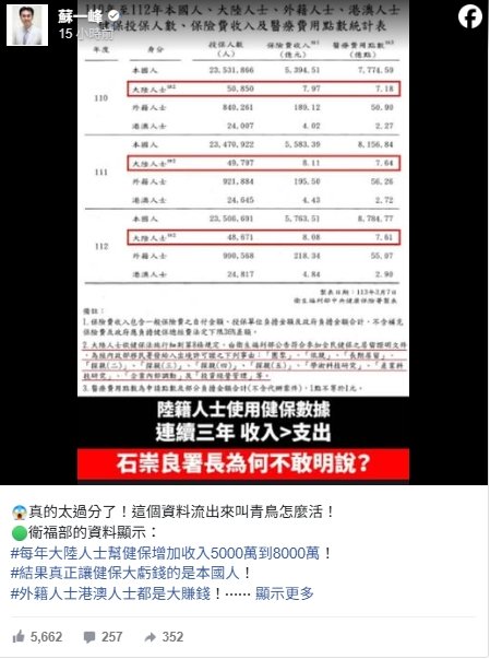 蘇一峰另指出,“衛福部”的資料顯示:每年大陸人士幫健保增加收入5000萬到8000萬!他說:結果真正讓健保大虧錢的是台灣人!外籍人士港澳人士都是大賺錢!真的太過分了!這資料流出來叫青鳥怎麼活!早說過醫院看到99%浪費醫療的都是土生土長的台灣人。