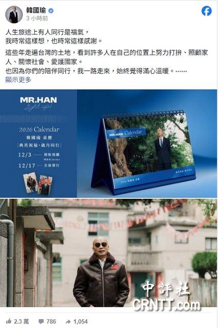 韓國瑜4日在臉書發文宣傳2026年《典亮祝福,歲月同行》的桌曆,還透露親筆簽了100張小卡,放在桌曆內隨機送出,數量不多,但每一張都帶著誠摯的心意,讓收到的民眾多一份額外的祝福!消息曝光後,一小時的時間已有超過萬名粉絲按讚、超過400則留言。