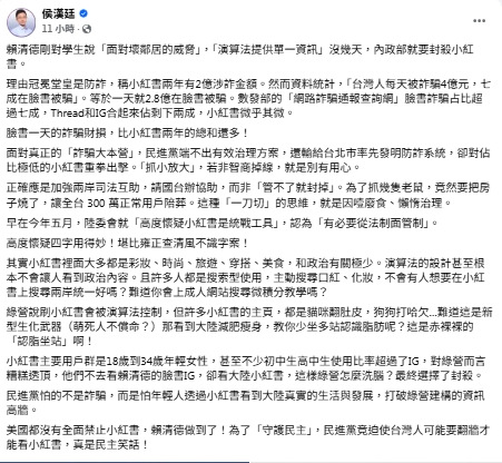侯漢廷4日在臉書發文表示,賴清德剛對學生說“面對壞鄰居的威脅”,“演算法提供單一資訊”沒幾天,“內政部”就要封殺小紅書。理由冠冕堂皇是防詐,稱小紅書兩年有2億涉詐金額。然而資料統計,“台灣人每天被詐騙4億元,七成在臉書被騙”。等於一天就2.8億在臉書被騙。“數發部”的“網路詐騙通報查詢網”臉書詐騙占比超過七成,Thread和IG合起來佔剩下兩成,小紅書微乎其微。