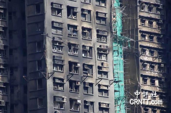 火災後的宏福苑,前一天停滿街道的消防車輛陸續撤離(中評社 盧哲攝)